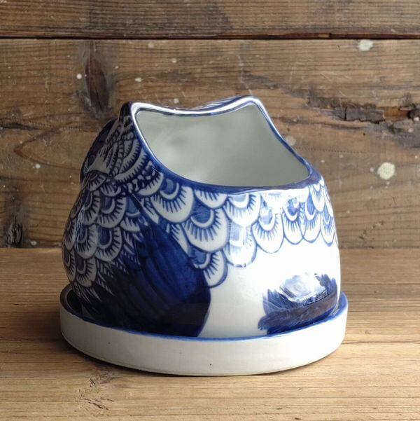 プランター 鉢 ガーデニング 園芸用品 花 染付 植木鉢 変わり植木鉢 フクロウ型 受け皿付き 藍と白のコントラスト 映える染付 陶磁器 皿付 和テイスト 庭 【3024-11528217】