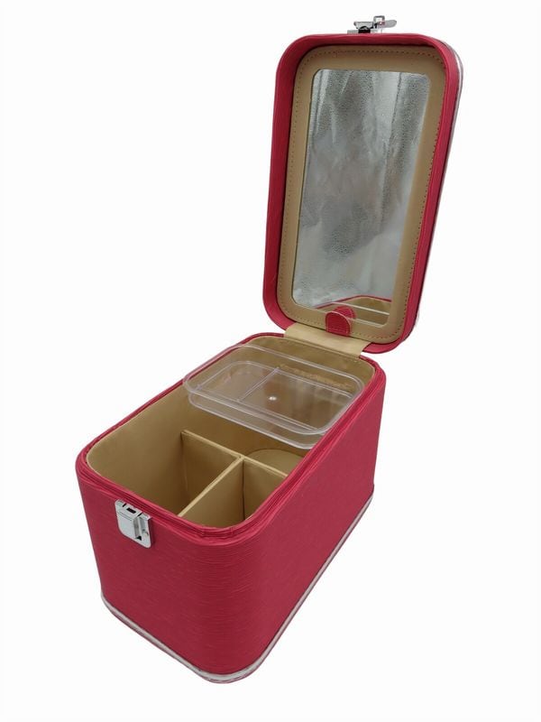 メイクボックス メイク道具 コスメ 美容 ヘアケア コスメボックス トレンチケース 無地柄 中仕切り付属 鏡可動式タイプ 女性の必需品 化粧品 使いやすい シンプル仕様 本体合板使用 しっかり 無難なデザイン 無地柄生地 ふたの裏側鏡取り付け 角度調節可能 中皿 T字型の仕切り 収納さらに便利 【3002-11446499】