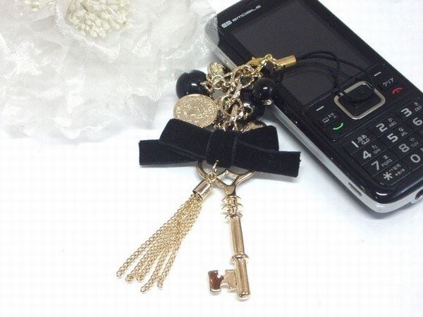 リボン・鍵・パール・タッセル・コインパーツがジャラっと下がって可愛い携帯ストラップです♪