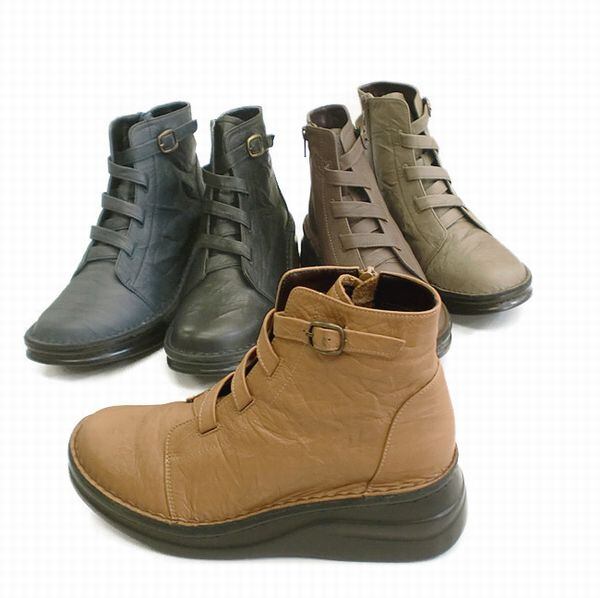 編み上げた皮紐と内側ファスナーのレースアップブーツ!