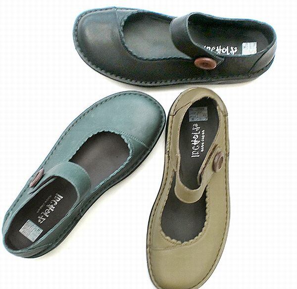甲部分の太いストラップに横ボタン、マジックテープ止めのフラットパンプス