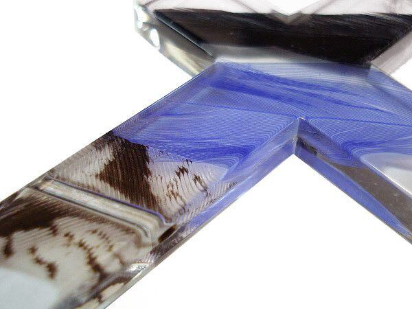 透明クロスの中に閉じ込めた3色のホンモノの鳥の羽根が、光を浴びると鮮やかに輝きます(人´∀`)
