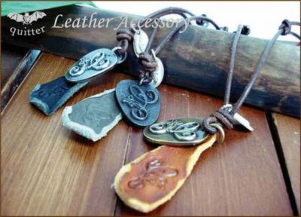 ヴィンテージの風合いを出すように加工した本皮丸紐ネックにレザーに押す型押しスタンプをモチーフにしたトップと実際に型押しした風合いの良いイタリアンウォッシュレザーをトップにしました。