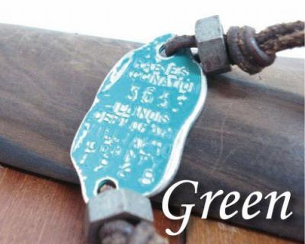 ヴィンテージの風合いを出すように加工した本皮丸紐ブレスにトップはアメリカのアンティークタグモチーフです。
