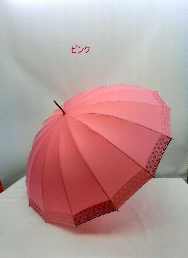 16本骨裾花柄ヒートカット手開き雨傘です。