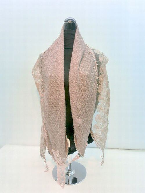 豪華な渦柄ケミカルレース&ポリエステル生地&刺繍糸コットンの異素材を組み合わせたオシャレな剣先ストールです。巻きかたで色々な秋冬のオシャレが楽しめます。