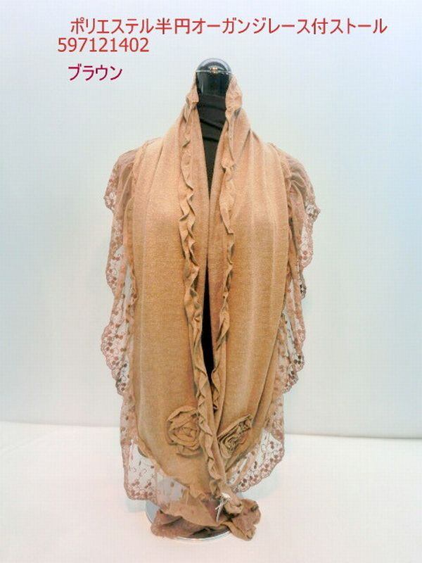 ストール ファッション小物 レディースファッション ポリエステル 半円 オーガンジ レース付 豪華 高級感 花コサージュ 秋冬のオシャレ マフラーとして 【3001-9887693】