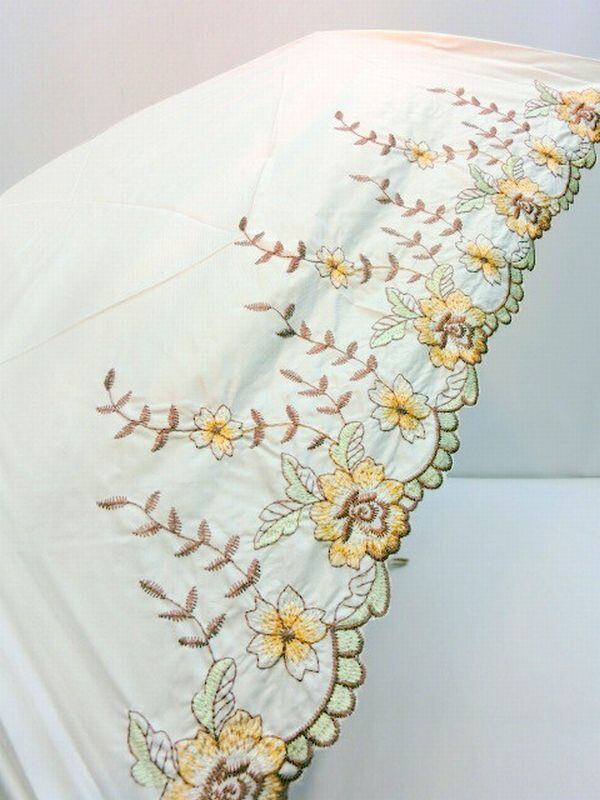 高度な耐水性と、強い紫外線の遮蔽率を合わせ持つ全天候型の生地使用で、UVカット99%遮蔽効果のある晴雨兼用ミニ折り畳み傘です。裾に豪華な裾ローズチュール柄刺繍を施しました。
