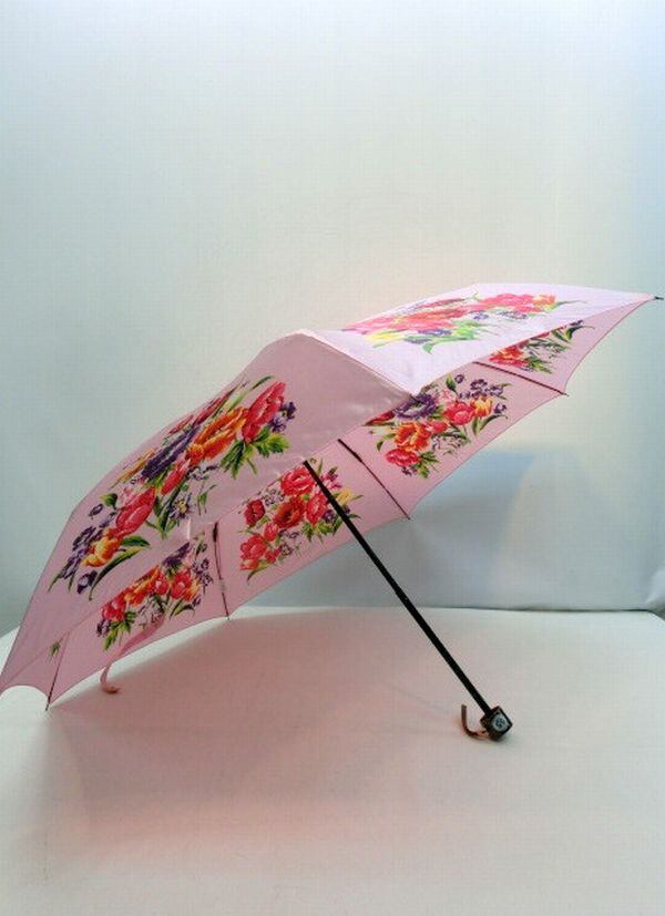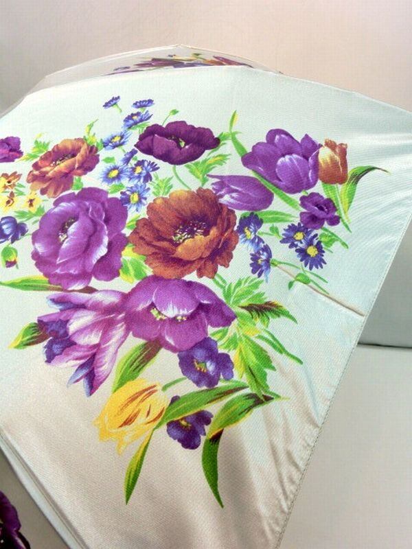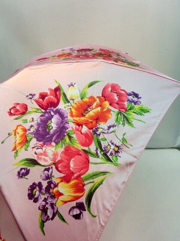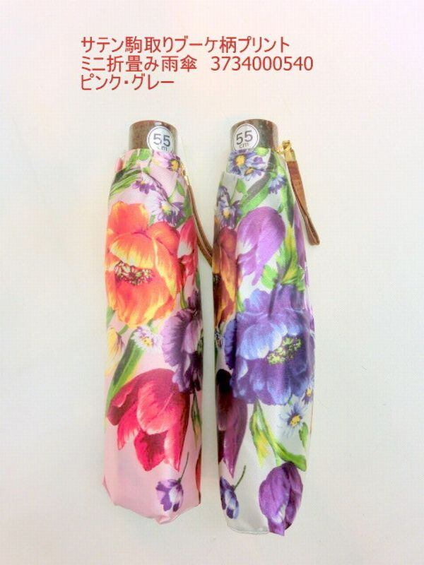 光沢感のあるナイロンサテン生地に、駒取り(7つの柄が独立している)の手法でブーケ柄をプリントしたオシャレなミニ折り畳み雨傘です。軽量7本骨使用で軽くて大きいサイズの折畳傘です