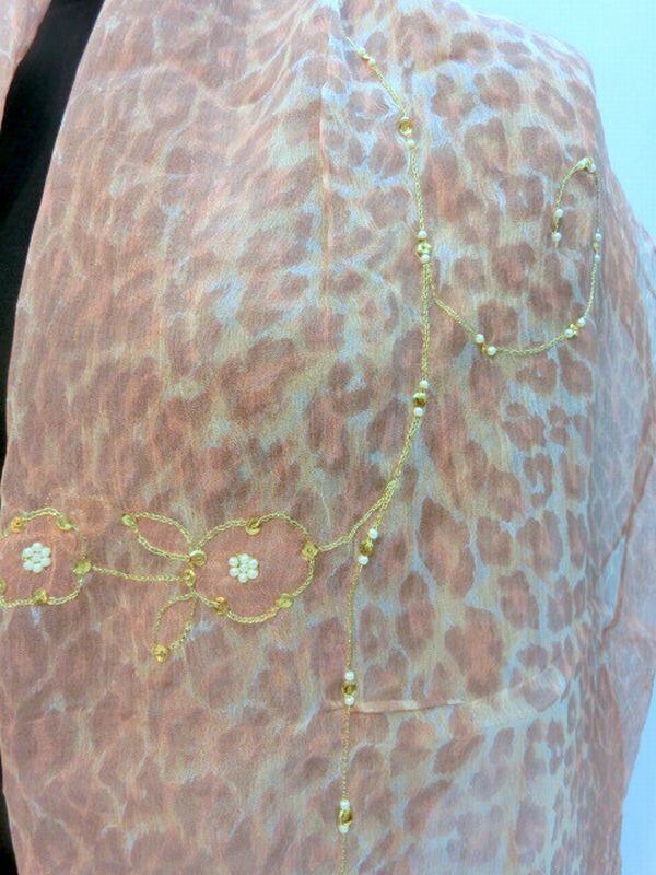 ふんわりフワフワの軽やかなオーガンジーアニマルプリントに、ビーズ刺しゅうをあしらった豪華で、オシャレなストールです。