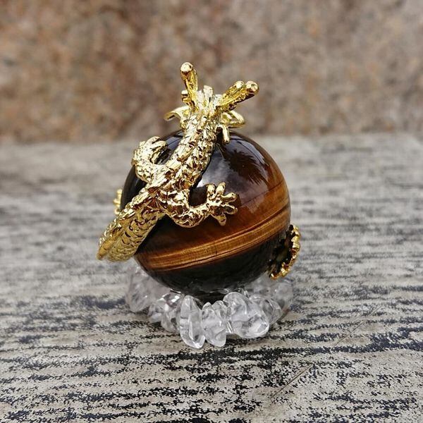 約30mmの虎目石を抱きかかえた一匹の金色の龍