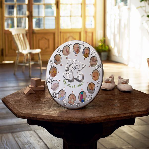 ガラガラを持ったくまさんがかわいらしいフォトフレーム。お子様の誕生日から1歳になるまでの成長の足跡を、ひと月毎にひとつのフレームにまとめられます。出産祝いにおすすめです。