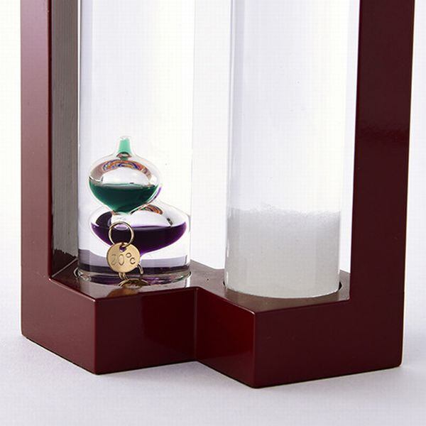 室温の変化により、ガラス球体が浮き沈みします。浮いている球体についているプレートで目安の温度を読み取ります。