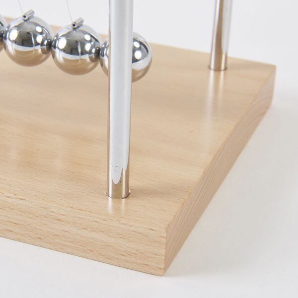 原理:球を引っぱって離すと、その球は他の静止した球へ向かって衝突して、静止する。この瞬間、金属球がぶつかったのと逆側の球は、最初の金属球と同じ速さで弧を描いて飛んでいく。そして、逆の球が並んだ球に戻ってぶつかると、また同じ現象が起きる。これは複数の球でも同様。