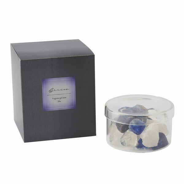 透明なガラスケースに天然石と香りのついたジェルストーンを組み合わせたラグジュアリーなムード漂い、眺めるだけではなく香りも楽しめるフレグランスインテリアです。