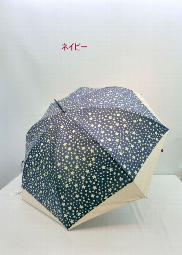夜空に輝く満天の星空を表した婦人用ジャンプ雨傘です。裾を無地の切り継ぎにすることでユニークさやキュートさを演出しました。