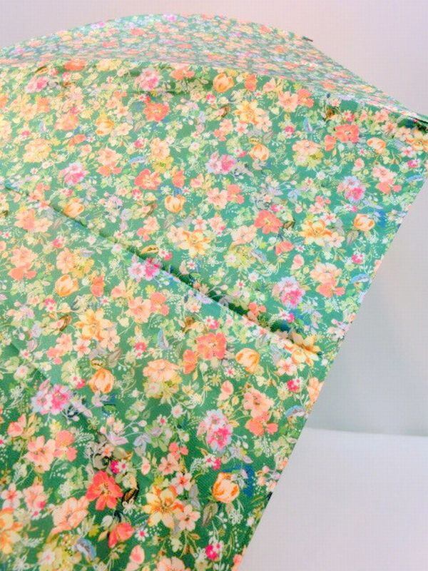 艶感があり高級感のあるつやつやサテン生地に小花柄を転写プリントした生地使用の折り畳み雨傘です。広げやすく畳みやすい3段コンパクト軽量骨に張りました。