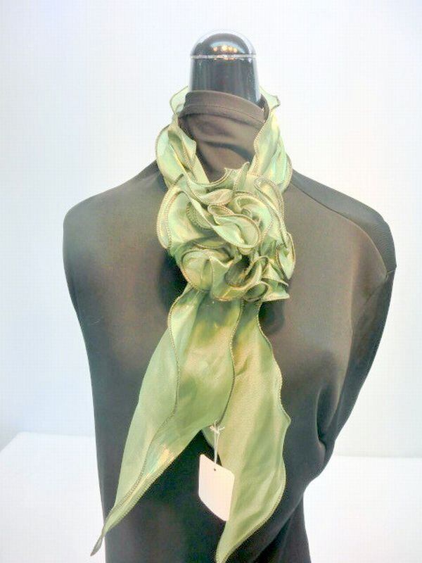 大きな花のコサージュの付いたワイヤー入り無地スカーフです。形状記憶ワイヤー入りなので、お好みの形に曲げて&留めてが可能です。