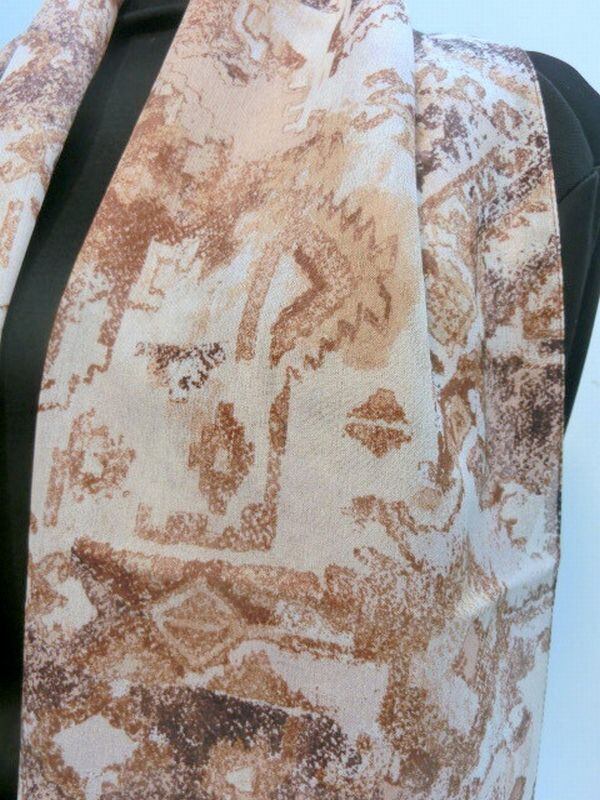 ふんわり柔らかい肌になじむ滑らかなタッチのポリエステルシフォン生地にぼかし幾何柄をプリントしたイタリー製ロングスカーフです。イタリー製の生地の風合いや色彩も柄もご覧いただき、秋冬の首回りのオシャレのポイントににぜひお使い下さい。