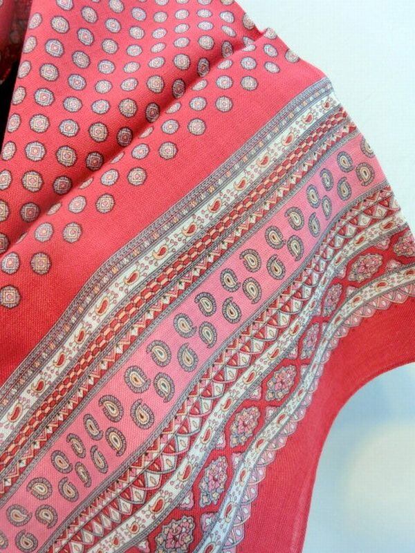 柔らかでしっとりした肌さわりのウール100%の小花プリント日本製大判スカーフです。大判なので肩からも巻けます。