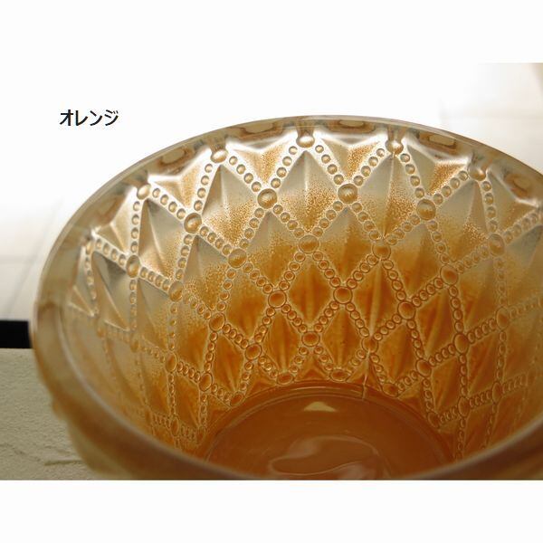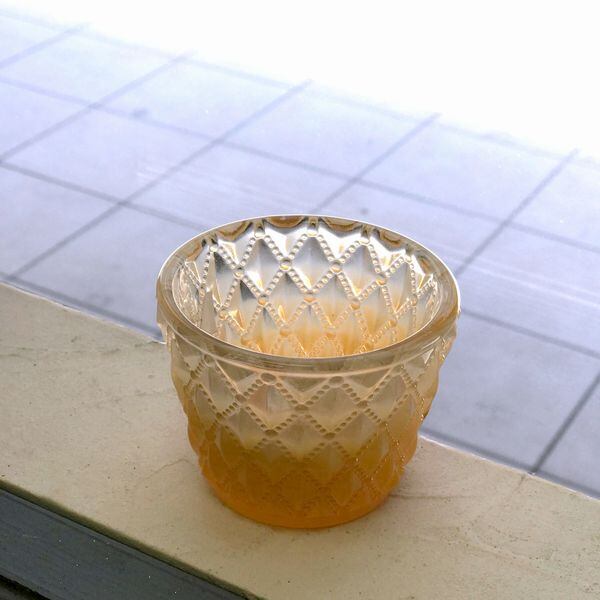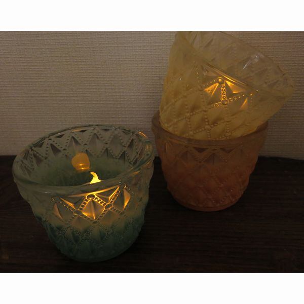 かわいいシャーベットカラーのキャンドルホルダーです。グラスから透ける明かりが表面のデザインでキラキラと揺れてとても綺麗です。