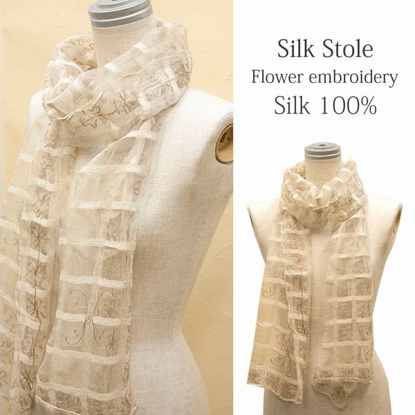 スケ感が涼やかな雰囲気を作ってくれるシルクのストールです。繊細な花がらの刺繍がお洋服のさりげないワンポイントになります。