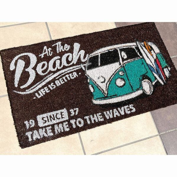 屋外用ドアマット マット カーペット ラグ 家具 インテリア 玄関マット Coir mat コイヤーマット AT THE BEACH アメリカン雑貨 モチーフバス 大きく描かれた インパクトあるデザイン コイヤー 青いバス 映え おしゃれデザイン 敷くだけで雰囲気変わる とってもオシャレ 裏面ゴム 滑りにくい仕様 【3032-9299757】
