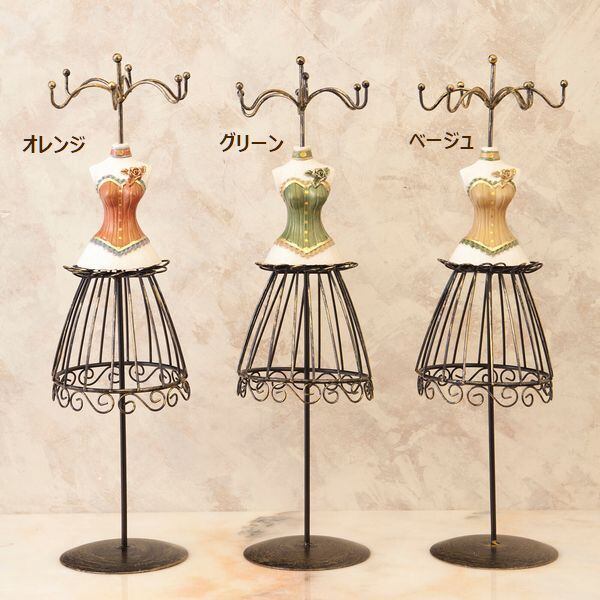 トルソーモチーフのオシャレなアクセサリースタンド可愛いドレスを着たデザインでオレンジ、グリーン、ベージュの3色展開です。
