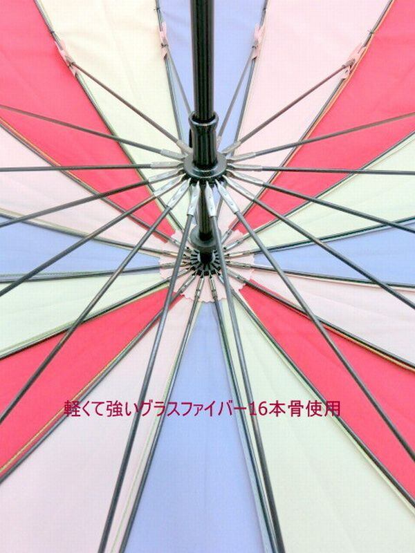 16本骨二重張り裏面4色張り分け手開き雨傘です。表は無地・裏面は4色のカラフルな張り分けがオシャレでキュート雨の日が楽しくなる雨傘です。