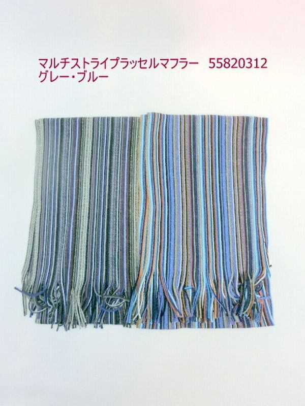 ソフトタッチ生地アクリルマルチストライプ柄のオシャレなマフラーです。男性でも女性でも秋冬のファッションのポイントにぴったりの高級マフラーです。