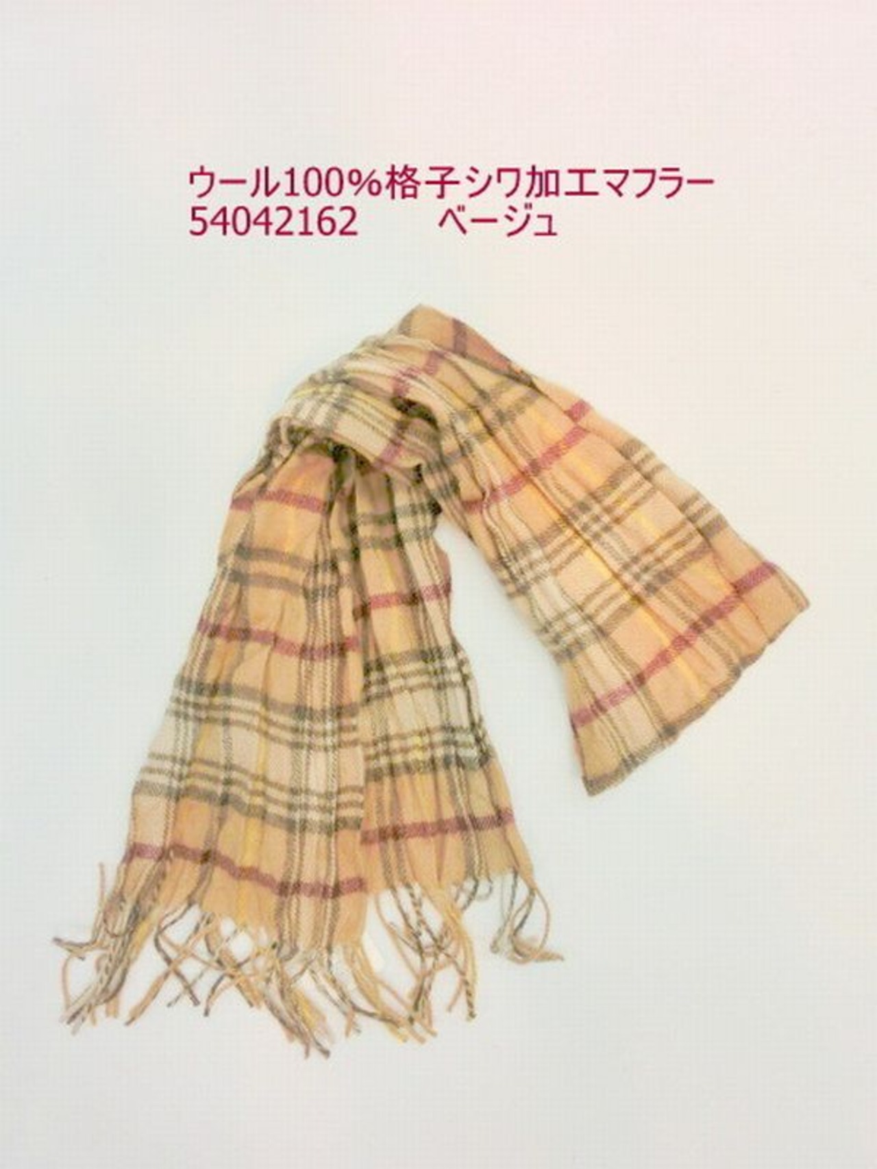 ソフトタッチのウール100%生地の格子マフラーです。シワ加工を施し、女性でも男性でも使用できます。