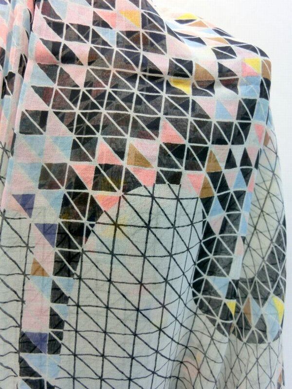 コットンレーヨンの柔らかい格子生地にモザイク柄をプリントしたビッグサイズストールです。オシャレなタッセル付で、肩から掛けたり首に巻いたりと、春夏のオシャレやUVケアに重宝するストールです。