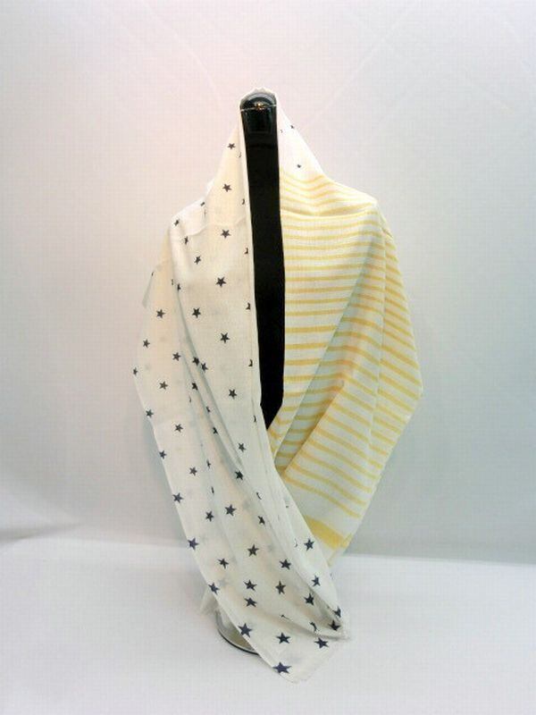 サラサラの肌に優しい、綿100%の生地に、星と3段階の太さのボーダーをプリントしました。柄の出し方や、巻き方で色々なオシャレが楽しめる春夏ストールです。