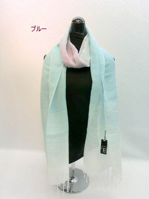ザックリと織り上げた、春夏素材の麻を使用したストールです。ボーダー柄とグラデーションをミックスしたオシャレな春夏のストールです。
