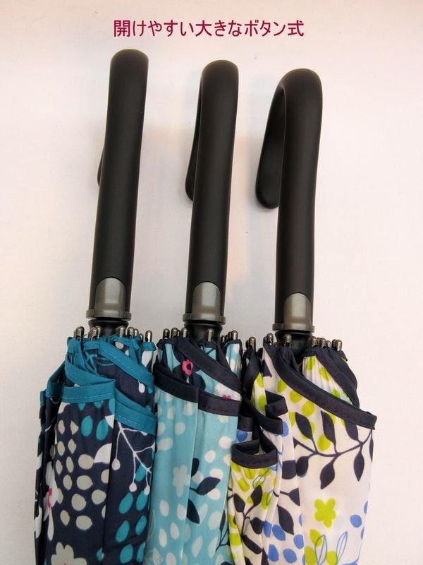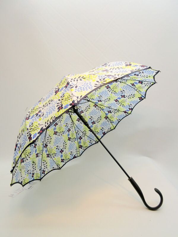 シームレス(一枚張)で縫い目がなく、連続柄が楽しめます。使用骨は可愛らしいお花型グラスファイバー骨のジャンプ雨傘です。