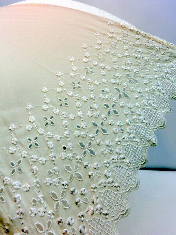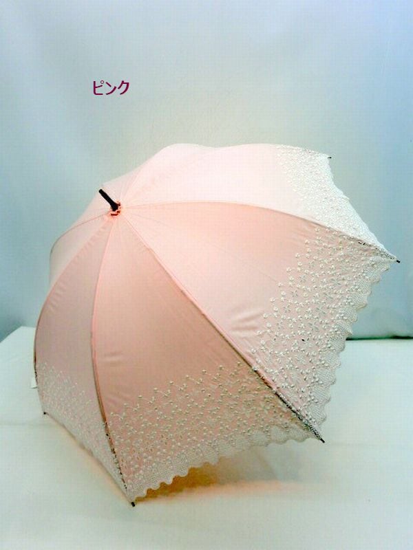 UVカット99%の手開き日傘です。裾が豪華なスカラエンブロ柄です。生地が綿入りなので涼しく感じます。