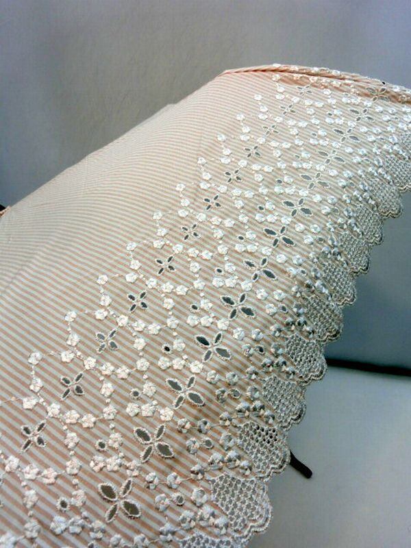 UVカット90%以上の涼しげなコットン入りストライプ生地に、オシャレで豪華なスカラエンブロレースを付けた日傘です。お出かけの際の紫外線除けとしてはもちろん、コンパクトサイズなのでご通勤やご旅行にもご活用ください。