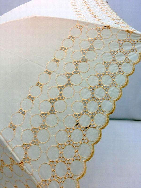 クラッシックでエレガントな伝統的手法で展開する純パラソル(日傘)、折畳傘です。熱い真夏日でも快適な日陰を作り、上からの直射日光による熱を抑え、紫外線対策に効果的です。豪華で可愛らしいラウンドアバウト柄刺繍折畳傘 刺繍の日傘です。傘を収納しやすくするために袋の口が大きくなっています。