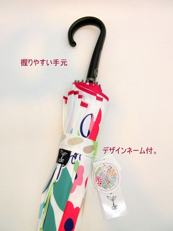 シームレス(一枚張)で縫い目がなく、連続柄が楽しめます。使用骨は可愛らしいお花型グラスファイバー骨のジャンプ雨傘です。