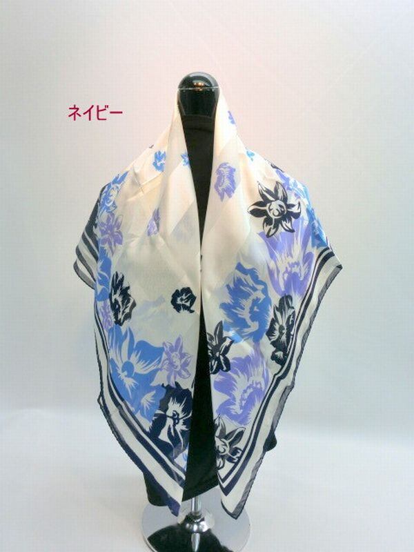 艶感があり高級感のあるサテンストライプ生地使用の日本企画中国製大小花柄柄の四角大判スカーフです。秋冬のオシャレのアイテムとして首に巻いたり、ベルト代わりに腰に巻いたり、バッグに付けたりと多様にご利用いただけます。