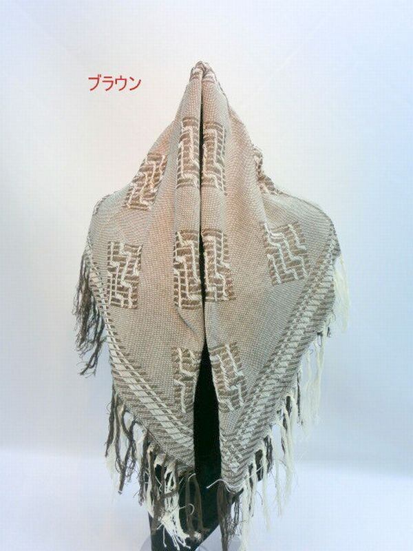 綿100%幾何柄のアフガンストールです。四角で長いフリンジ付、秋冬のオシャレに肩から・首からいろいろなオシャレに使える日本製ストールお使いください。