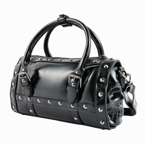 【商品の説明】エンボス加工のスカルフェイスに多数のピラミッドスタッズがROCKでラグジュアリーなミニ2WAYボストンバッグ型ハンドバッグ!脱着式のベルトが付属するので肩掛けのショルダーバッグにもなる2WAYデザイン!ミニマルサイズ&スカル総柄裏地でゴシック系女子にピッタリです!ラグジュアリーなロック度満点のデザインでモード系、ビジュアル系、ロック系、ゴシック系にオススメの2WAYハンドバッグです!
