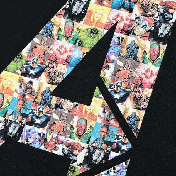 【商品の説明】「MARVEL(マーベル)」コミックスの人気キャラクター軍団Avengers(アベンジャーズ)のトレードマーク「A」のマークを様々なキャラクター達のコラージュでセンス良くプリントしたカッコいいTシャツ!