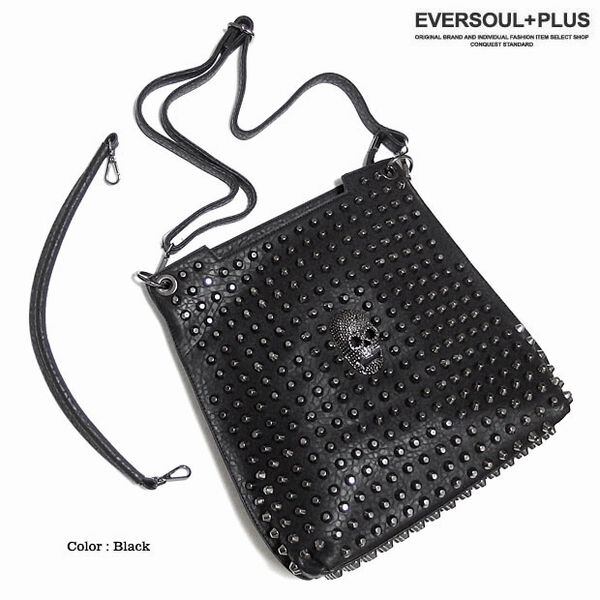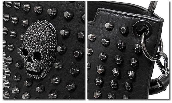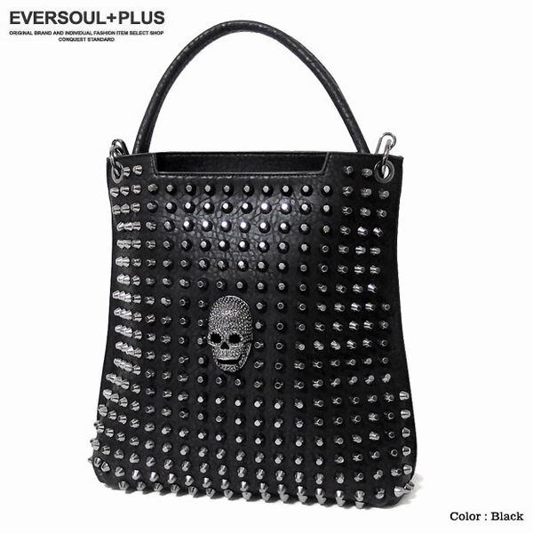 ★多数のスタッズ打ちとスカルのデコレーションがラグジュアリーなフェイクレザー2WAYハンドバッグ!脱着可能な2種類のベルト付属でショルダーバッグとしても使える2WAYバッグです!ショルダーベルトは長さの調整も可能!もちろん収納力も充分の大きめサイズでユニセックスで使える2WAYバッグです!