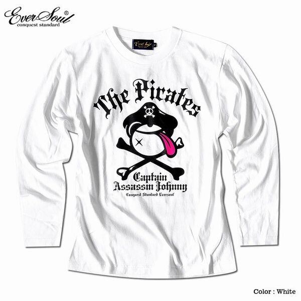★海賊旗をイメージしたジョニー君のプリントがカッコ可愛いEVERSOULマスコットキャラクターの殺し屋ジョニープリントロンT!バックプリントは厚盛のラバープリントになっており立体感があります!カッコ可愛いデザインで男女問わずオススメの海賊ジョニープリント長袖Tシャツです!