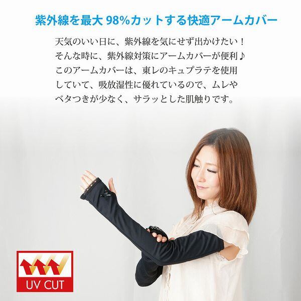 アームカバー ファッション小物 レディースファッション 腕カバー 日よけ 紫外線防止 紫外線対策 UV対策 UVケア 冷感 涼感 吸汗 速乾 日本製 リボン 紫外線最大98%カット 接触冷感 UVアームカバー 紫外線気にせず 東レ キュプラテ 吸放湿性優 ムレやベタつき少ない サラッとした肌触り 2枚セット 接触冷感素材 暑い夏 ひんやり快適着用 ムレやベトつき少ない サラっとした肌触り 袖口レース 上品 エレガントデザイン 便利 指穴付き UVカット率最大98% ブラック98% 【3034-960926