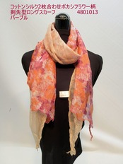 しっとり柔らかいコットンシルク生地を、無地&ボカシフラワー柄を2枚合わせし、スカーフの先を剣先型メロウ仕上げしたロングスカーフです。柄の出し方でいろいろな巻き方ができ秋冬のオシャレのポイントにぴったりです。