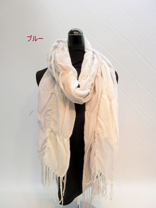 ソフトアクリル生地使用の、ふっくら柔らか格子柄シャンブレーシワ加工ストールです。秋冬のオシャレ、UVケアや首周りのオシャレのポイントに是非お試しください。
