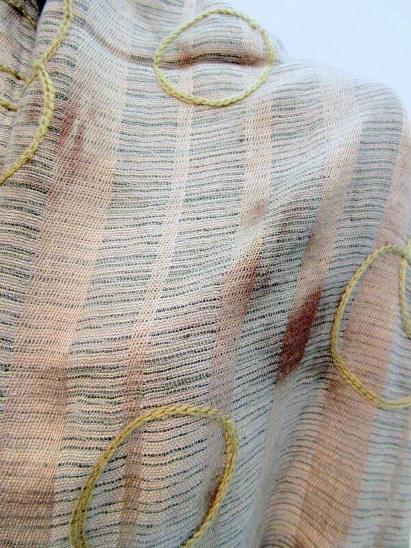 綿60%、アクリル40%のザックリした生地を使用したストールです。高級感のあるアリ刺繍&グラデーション加工を施しました。