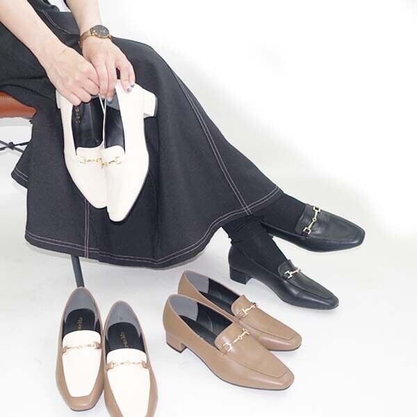 高級感のあるゴールドのビットモチーフとスクエアトゥのシルエットが上品なローファーは、メタリックラインを施したヒールと、すっきりとしたシルエットで女性らしさをアップ。
